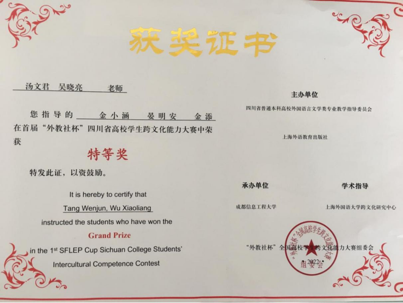 喜讯!万象城allwincity官网学生荣获“外教社杯”全国高校学生跨文化能力大赛四川赛区特等奖、全国决赛二等奖