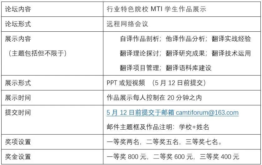 学生论坛诚邀各院校MTI学生分享翻译学习及实践中的各种成果。为鼓励学生积极参与,本次学生论坛将邀请专家对展示作品进行评奖,对优秀作品颁发奖金及证书。