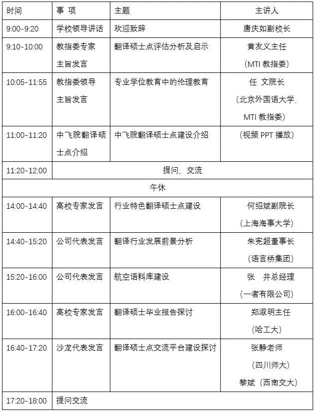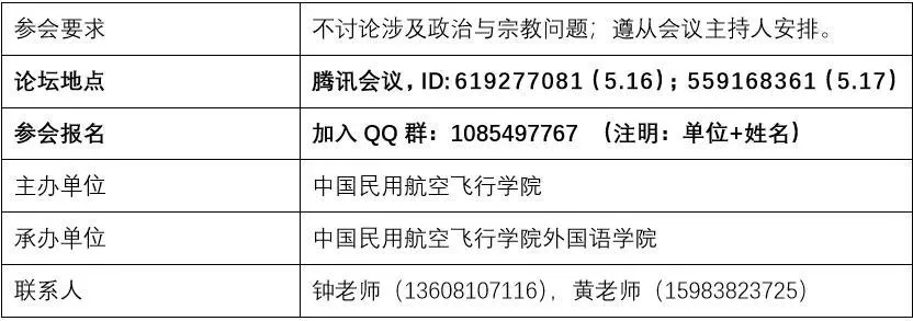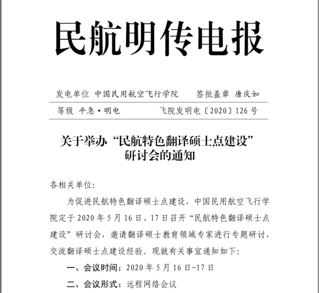 中国民用航空飞行学院定于2020年5月16日、17日在线上召开“民航特色翻译硕士点建设”研讨会,邀请翻译硕士教育领域领导与专家进行专题研讨,交流翻译硕士点建设经验。本次会议下设专家论坛和学生论坛。专家论坛邀请MTI教指委领导、院校专家、公司代表探讨翻译硕士点建设中的部分关键问题,学生论坛诚邀各院校MTI学生分享翻译学习及实践中的各种成果,促进校际间学生交流。