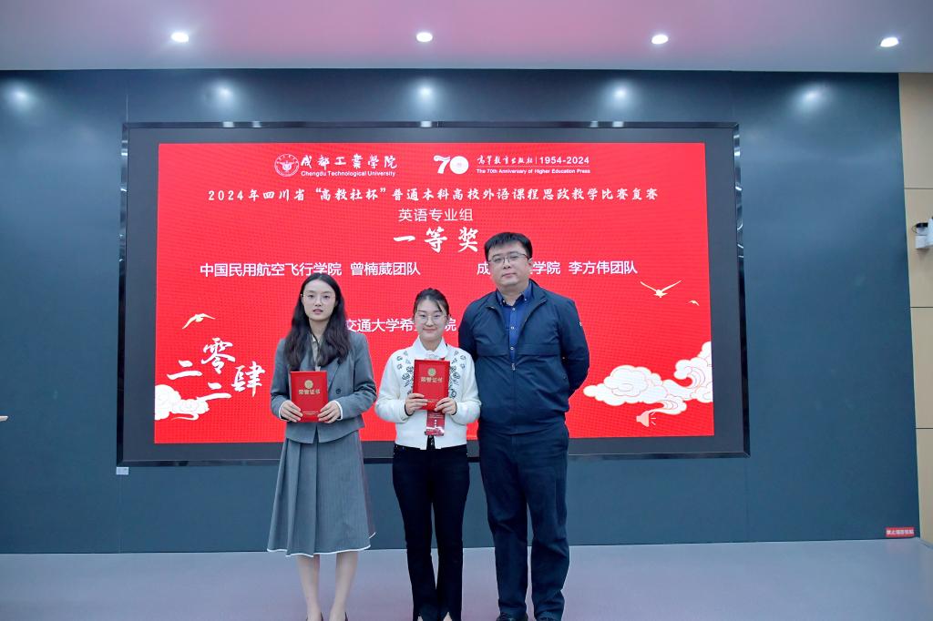 近日,由四川省普通本科高校外国语言文学类专业教学指导委员会和四川省高等教育学会高校外语专业委员会主办,成都工业学院和高等教育出版社承办的四川省“高教社杯”普通本科高校外语课程思政教学比赛落下帷幕。由我院曾楠葳、黄思杰、叶家春老师组成的教师团队获四川省英语专业组一等奖第一名,并将连续两年再次参加全国总决赛。