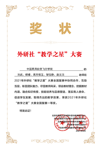6月17日,2021年外研社“教学之星”全国复赛获奖名单新鲜出炉,大赛主题为“外语教材的有效使用:培根铸魂,启智增慧”。自赛事发布以来,经全国各院校选拔推荐,共有667个教学团队参加复赛,其中大学英语组395个、英语类专业组272个。最终,万象城allwincity官网飞行基础英语教研室主任刘武副教授带领团队获得大学英语组全国复赛一等奖。这也是刘武团队自去年年底,在高教杯首届全国高校外语课程思政教学比赛拿到大学英语组四川省一等奖和全国二等奖后,短短数月在又一外语重要赛事中取得的优异成绩,突显了团队精神,充分展现了团队实力。
