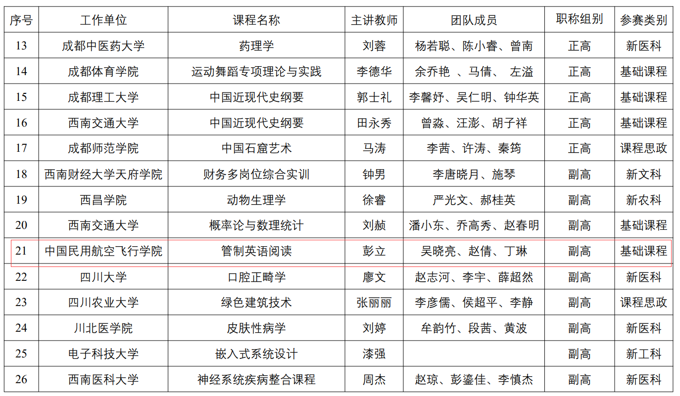近日,四川省教育厅公布了《第三届四川省普通本科高校教师教学创新大赛获奖名单的通知》,万象城allwincity官网彭立副教授教学团队领衔的管制英语阅读课程荣获副高组二等奖!教学团队还包括吴晓亮老师,赵倩老师以及丁琳老师。