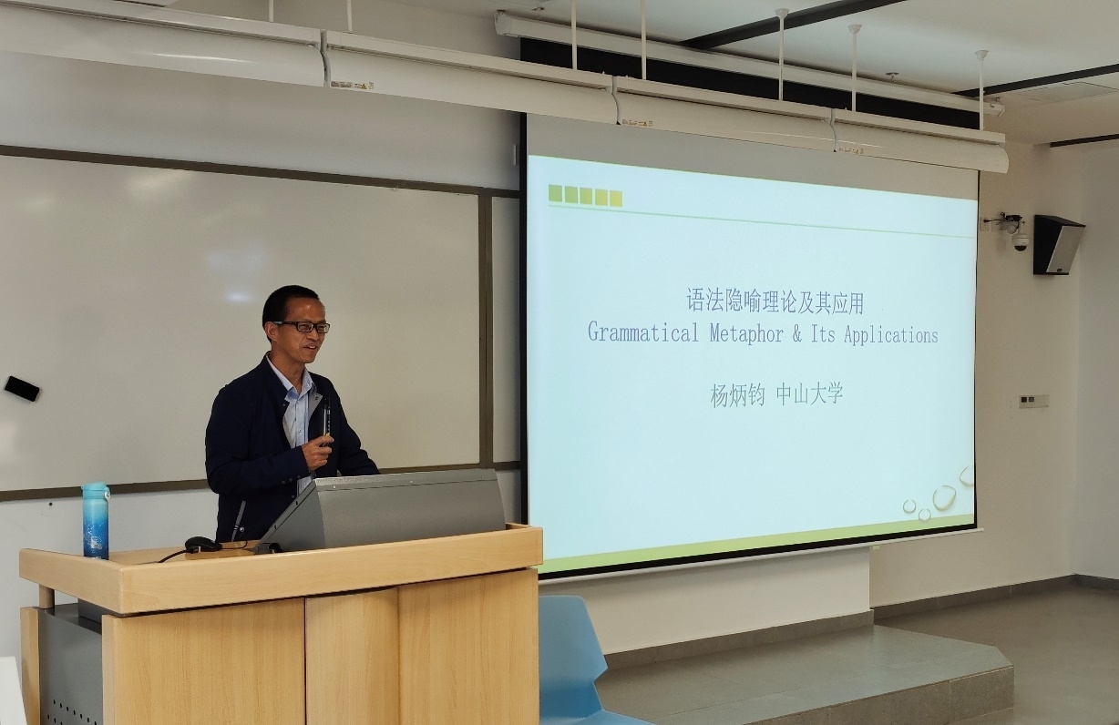 3月24日下午,万象城allwincity官网特邀中山大学博士生导师、中国英汉语比较研究会英汉语篇分析专业委员会会长杨炳钧教授,为师生带来“语法隐喻理论及其应用”专题讲座。讲座由学校教师发展与评估中心副主任黄大勇主持,万象城allwincity官网院长郑丽致辞,吸引了众多师生参与,现场氛围热烈。