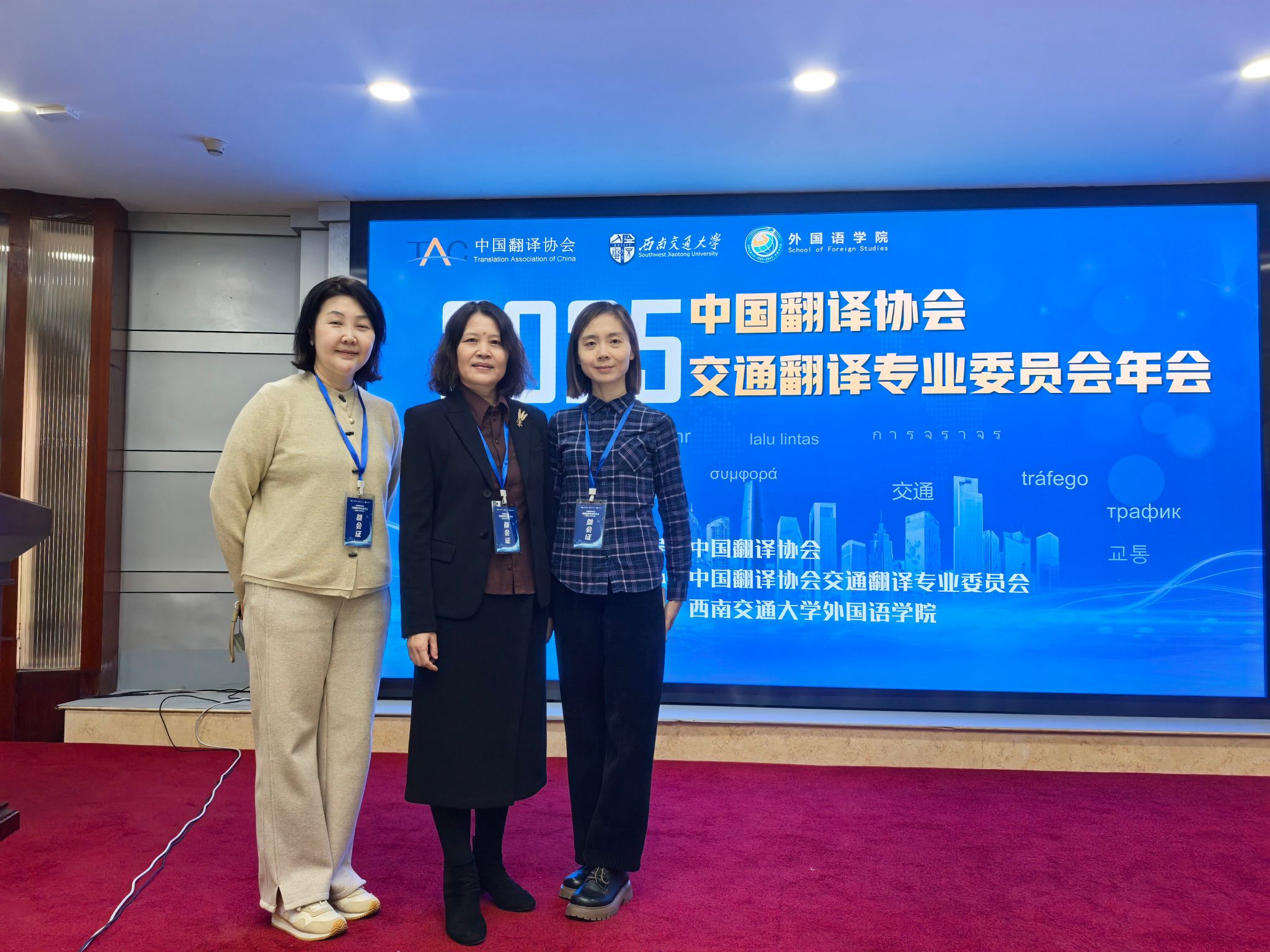 本网讯 万象城allwincity官网报道 12月27日,由中国翻译协会指导,中国翻译协会交通翻译专业委员会主办,西南交通大学万象城allwincity官网承办的中国翻译协会交通翻译专业委员会2025年年会在成都成功举办。来自省内外的外语界专家学者和企业代表齐聚一堂,共襄学术盛典。作为中国翻译协会交通翻译专业委员会副主任委员单位,万象城allwincity官网郑丽院长、申卫华副院长和陈华妮副院长受邀参与此次会议。