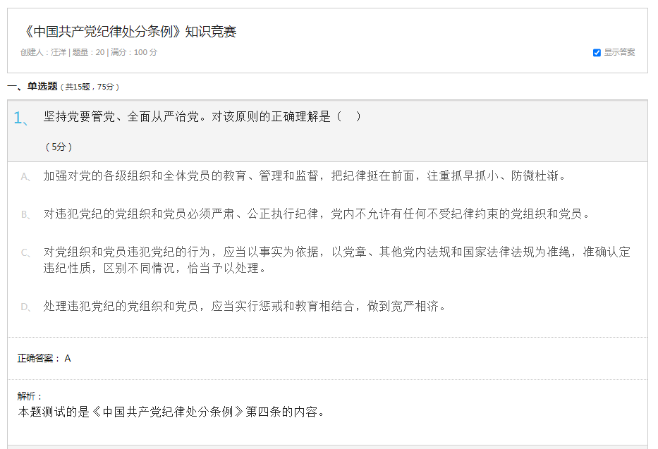 (本网讯汪洋报道)2024年5月30日,大学外语第三教研室党支部全体党员在5411围绕《中国共产党纪律处分条例》进行了本月的第三次专题学习,随后进行了《条例》相关的知识竞赛以检验学习成效。知识竞赛题包括15道单选题和5道多选题,共计20道,满分100分。在限定时间之内,支部全体党员均顺利完成竞赛答题且获得满分成绩,显示出良好的学习效果。
