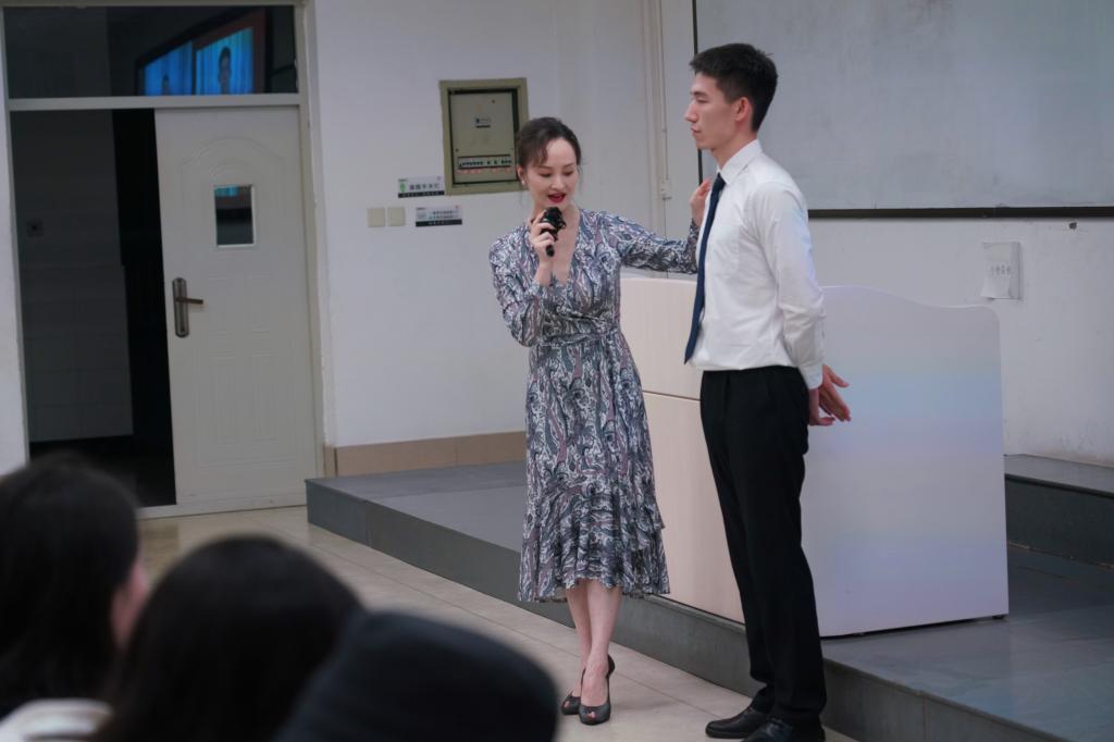 在现场互动环节,许教授对同学的仪容仪表和着装打扮进行示例讲解,包括皮带朝向、皮鞋款式、领带颜色、头发发型、西装扣子、妆容和站姿等细节。许教授强调,一个人的着装打扮是他自身教养最形象的说明,要管理好自己的情绪、体态、着装、发型、妆面和配饰,方能在面试中留下良好印象。