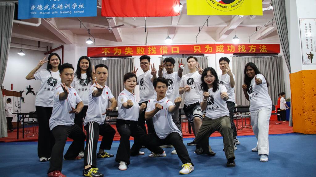 表演结束,留学生们下场实操,在教练的指导下学习中华武术的基本手势和步法,并学习连环拳的基本套路。集体练习之余,留学生和武术小教练们两两结对,互相切磋,活动现场笑声不断,精彩连连。来自蒙古的留学生在看完武术表演后感慨:“中国武术,真厉害!”来自柬埔寨的留学生也表示,“这是我第一次体验中国武术,太好玩了!我喜欢中国!”