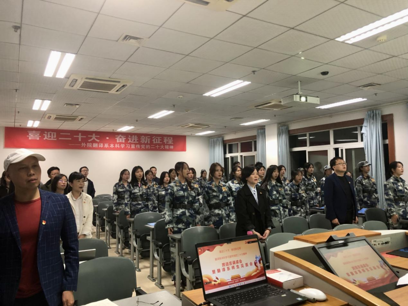 10月25日晚7点,“喜迎二十大•奋进新征程”——外院翻译系本科学习宣传党的二十大精神跨语言诵读会暨翻译系师生见面会在5教415教室召开。万象城allwincity官网院长肖凌、党委副书记段震、副院长郑丽、翻译系主任刘武、吕兆芳博士、翻译系全体教师和翻译系22级全体学生参会,本次活动由翻译系党支部、翻译系主办,本科生党支部承办。